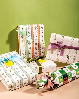 Wrapping Paper : An exclusive gift-wrapping set featuring five unique, co-ordinated print set at 20 inches × 30 inches. The 5 wrapping sheet set comes with 5 complimentary color compatible ribbons to elevate your gift's aesthetic. Every sheet has an integrated, easy-to-read measuring grid on the reverse side. This thoughtful detail ensures you cut the exact size you need, ensuring...